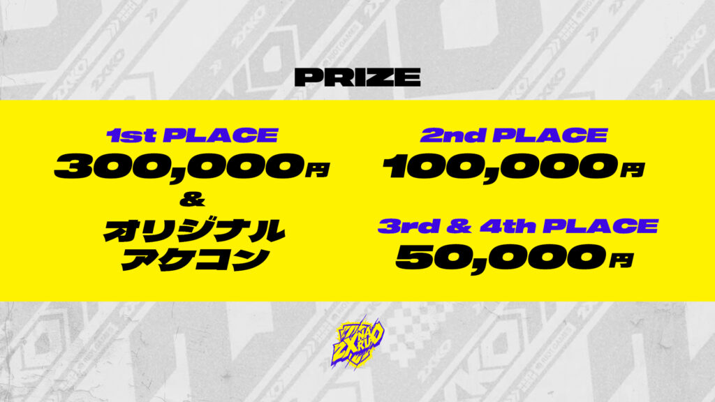 1位:30万円+オリジナルアケコン 2位:10万円 3位タイ:5万円 ※個人への賞金は源泉徴収分を引いた金額でのお支払いとなります。 |